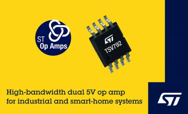 意法半導體的TSV792 5V雙運算放大器(op amp)具有50MHz的增益帶寬積和低輸入失調電壓、10pA輸入偏置電流等高精度特性。