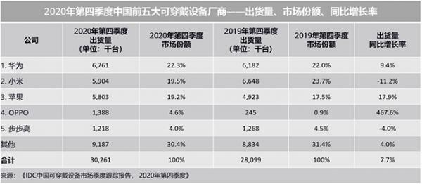 | 2020年Q4中國可穿戴設備市場(chǎng)份額排行:華為、小米、蘋(píng)果、OPPO、步步高前五 |