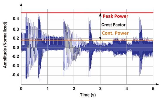 首先需要定義的兩個(gè)術(shù)語(yǔ)是峰值功率和連續功率。峰值功率是ZD瞬時(shí)音頻功率。它將決定為物理輸出的電源設計多少功率。連續功率是一段時(shí)間內平均的音頻功率。在電源設計的背景下,連續功率是系統在不超過(guò)組件溫度或平均電流額定值的情況下可以提供的指定輸出功率。圖 1提供了峰值和連續音頻電平的示例。它們與波峰因數相關(guān),波峰因數是波形峰值與均方根 (RMS) 值之比的度量。