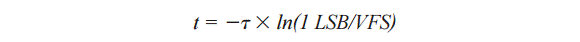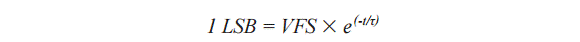 一個(gè)時(shí)間常數為24 ps或τ = 1/(2 × π × FPBW)。要了解ADC滿(mǎn)量程范圍內達到LSB尺寸要求所需的時(shí)間常數數量,就需要找出滿(mǎn)量程誤差或%FS。