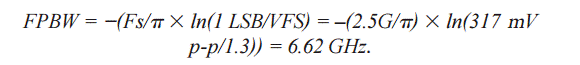 一般而言,一個(gè)ADC的內部前端需要在半個(gè)周期或采樣時(shí)鐘周期內建立(0.5/Fs),這樣才能提供對內模擬信號捕捉的精確表達。因此,對于一個(gè)12位ADC(采樣速率為2.5 GSPS,滿(mǎn)量程輸入范圍為1.3 V p-p)來(lái)說(shuō),全功率帶寬(FPBW)可通過(guò)下列瞬態(tài)公式推導: