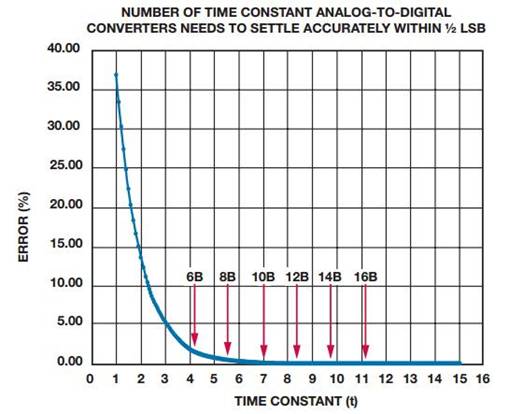 通過(guò)描繪歐拉數或eτ,可以繪出一條曲線(xiàn),以便每次通過(guò)常數都能方便地看出相對誤差。如圖1可見(jiàn),12位ADC樣本建立至大約1 LSB以?xún)刃钑r(shí)8.4個(gè)時(shí)間常數。
