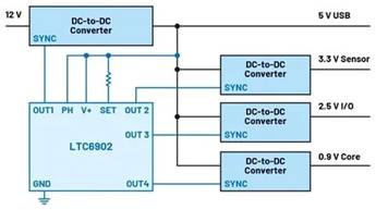 圖3顯示了圖1中采用LTC6902多相振蕩器的電源架構。它由5 V電壓供電。該電壓由一個(gè)將12 V轉換為5 V的降壓轉換器產(chǎn)生。對于開(kāi)關(guān)穩壓器,如果它們首先使用自己的內部振蕩器獨立啟動(dòng),然后再提供外部時(shí)鐘,則一般不會(huì )有問(wèn)題。詳細信息可在相應開(kāi)關(guān)穩壓器的數據手冊中找到。