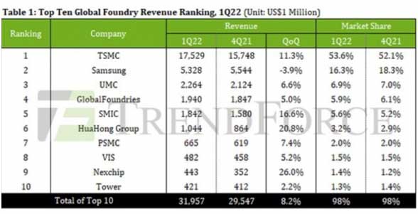 市場(chǎng)研究公司 TrendForce 公布了 2022 年一季度全球十大晶圓代工企業(yè)收入排行榜,臺積電繼續霸榜,并且進(jìn)一步擴大了領(lǐng)先優(yōu)勢。