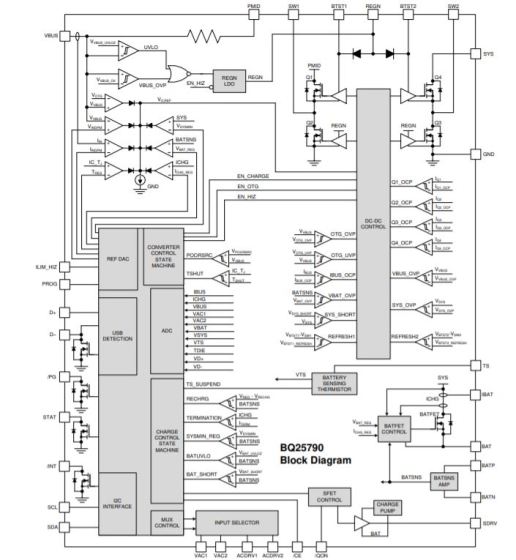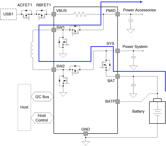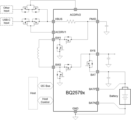 圖 3所示的完全集成的升降壓充電器可以簡(jiǎn)化 USB PD 充電解決方案的系統范圍設計。作為輸入過(guò)壓和過(guò)流保護電路的一部分,外部背對背 MOSFET 的控制邏輯和驅動(dòng)電路也集成到充電器中。這些功能消除了框圖中支持輸入電源路徑管理和輸入電流檢測的單元。