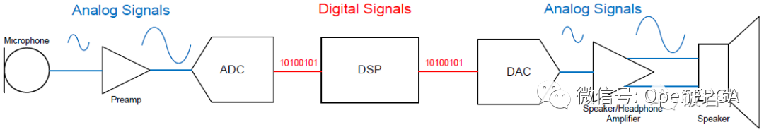數字音頻接口DAI,即Digital Audio Interfaces,顧名思義,DAI表示在板級或板間傳輸數字音頻信號的方式。相比于模擬接口,數字音頻接口抗干擾能力更強,硬件設計簡(jiǎn)單,DAI在音頻電路設計中得到越來(lái)越廣泛的應用。圖1和圖2對比傳統的音頻信號和數字音頻信號鏈的區別。