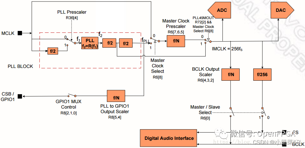 在I2S/PCM接口的ADC/DAC系統中,除了BCLK和FS(LRCLK)外,CODEC經(jīng)常還需要控制器提供MCLK (Master Clock),這是由CODEC內部基于Delta-Sigma (ΔΣ)的架構設計要求使然。MCLK時(shí)鐘頻率一般為256*FS,具體參考特定器件手冊。