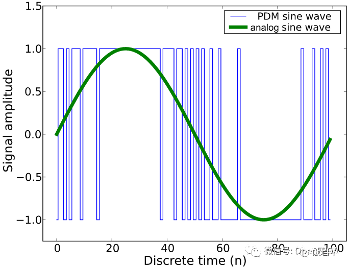 在以PDM方式作為模數轉換方法的應用接收端,需要用到抽取濾波器(Decimation Filter)將密密麻麻的0和1代表的密度分量轉換為幅值分量,而PCM方式得到的就已經(jīng)是幅值相關(guān)的數字分量。圖20示意為通過(guò)PDM方式數字化的正弦波。