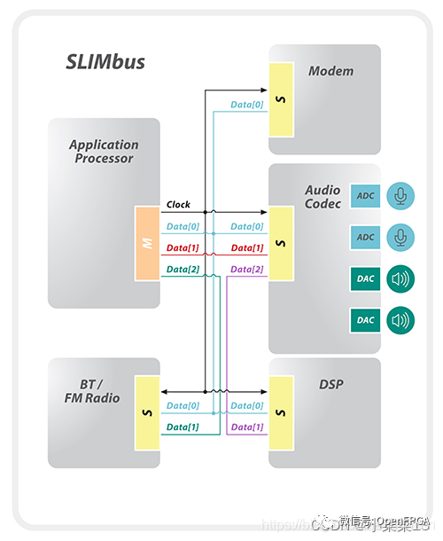 SLIMBUS,全稱(chēng) Serial Low-power Inter-chip Media Bus,是MIPI聯(lián)盟指定的一種音頻接口,用于連接基帶/應用處理器和音頻芯片,總線(xiàn)協(xié)議保證既能發(fā)控制信息,又能發(fā)數據信息,這樣就可以替換傳統的數據和控制兩種接口如I2S和I2C。SLIMbus v2.0是兩線(xiàn)制,多分支TDM接口,支持多主機和多個(gè)設備。它采用以高達28MHz的單數據速率(SDR)運行的CMOS I / O,具有固定的幀大小,支持主控和時(shí)鐘切換功能,以實(shí)現低功耗操作。SLIMbus v2.0還支持多個(gè)多通道,高質(zhì)量音頻流,相位相干性,以實(shí)現立體聲,麥克風(fēng)陣列和其他引人注目的功能。它還支持每臺設備最多八個(gè)通道的可擴展帶寬,以使峰值聚合帶寬最高達到224Mbps。