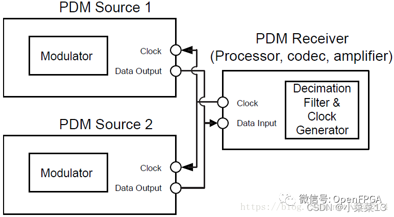 通過(guò)PDM接口方式,傳輸雙聲道數據只要用到兩根信號線(xiàn)。如圖21示意兩個(gè)PDM接口的發(fā)送設備與同一個(gè)接收設備的連接情況,比如Source 1/2分別作為左右聲道的麥克風(fēng),通過(guò)這種方式可以將采集到的雙聲道數據傳送到接收設備。主設備(此例中作為接收設備)為兩個(gè)從設備提供時(shí)鐘,分別在時(shí)鐘的上升沿和下降沿觸發(fā)選擇Source 1/2作為數據輸入。