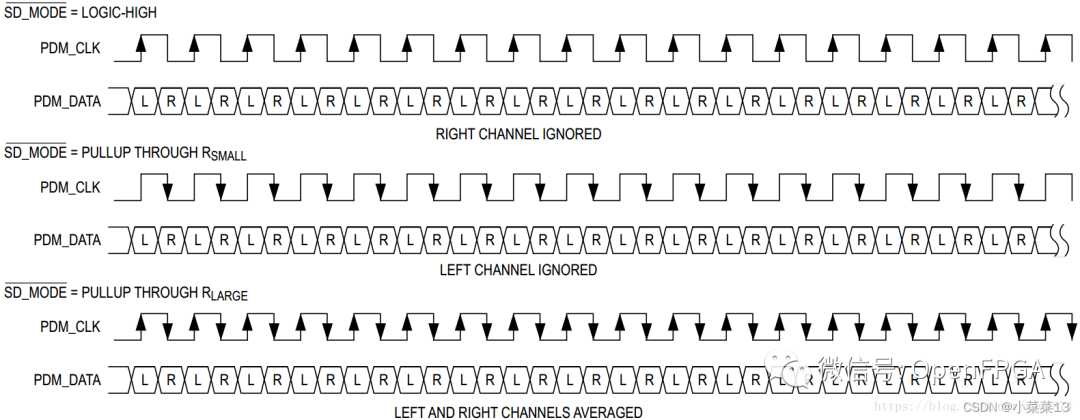 下圖為Maxim的Class-D類(lèi)型功放MAX98358對PDM接口時(shí)序的要求,可以看到它在PDM_CLK的上升沿采樣左聲道數據,在PDM_CLK下降沿采樣右聲道數據。、