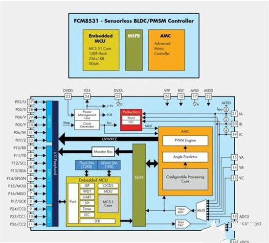 圖二 : FOC馬達控制 IC功能方塊圖(以FCM8531為例)