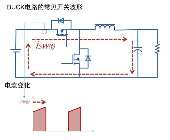 電源輸入電容與開(kāi)關(guān)環(huán)路形成一個(gè)電流環(huán)。這個(gè)電流環(huán)路的變化幅度大,Iout的幅度。頻率是開(kāi)關(guān)頻率。DCDC芯片開(kāi)關(guān)過(guò)程中產(chǎn)生,這個(gè)電流環(huán)產(chǎn)生的電流的變化,包含了較快的di/dt。