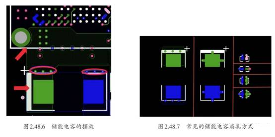 儲能電容的作用就是保證IC在用電時(shí),能在最短的時(shí)間內提供電能。儲能電容的容值一般比較 大,對應的封裝也比較大。在PCB中,儲能電容可以離器件遠一些,但也不能太遠,如圖2.48.6所示。常見(jiàn)的儲能電容扇孔方式,如圖2.48.7所示。
