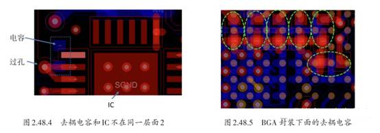 常見(jiàn)的 BGA封裝,其去耦電容通常放在 BGA下面,即背面。由于 BGA 封裝引腳密度大,因此去 耦電容一般放的不是很多,但應盡量多擺放一些,如圖2.48.5所示。