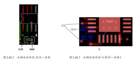 (4)保證去耦環(huán)路盡量小。去耦電容常見(jiàn)的擺放示例如圖2.48.2~圖2.48.4所示。圖2.48.2~圖2.48.4所示是SOP封裝的IC 去耦電容的擺放方式,QFP等封裝的與此類(lèi)似。