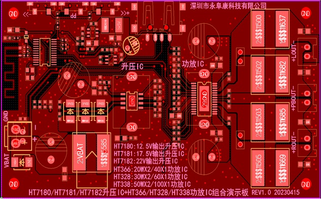 2.HT7180/HT7181/HT7182升壓IC+HT366/HT328/HT338功放IC組合演示板PCB頂層設計圖