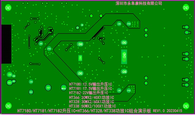 3.HT7180/HT7181/HT7182升壓IC+HT366/HT328/HT338功放IC組合演示板PCB底層設計圖