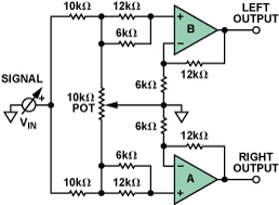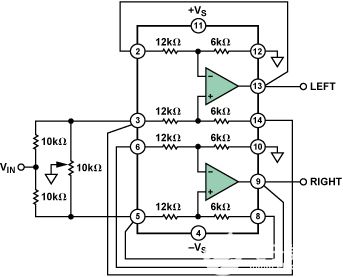 在該電路中,信號使用串聯(lián)10 kΩ電阻在兩個(gè)放大器之間分配。一個(gè)帶接地游標的電位計插入兩個(gè)同相輸入之間。電位計和10 kΩ電阻的組合呈現出輕負載,大多數電源都可以輕松驅動(dòng)。放大器的增益配置為3。當電位計游標位于任一端時(shí),一個(gè)輸入接地,因此沒(méi)有信號直通相應的輸出。另一個(gè)輸入看到 V在/2,因此其輸出為 1.5 × V在.游標位于中間時(shí),兩個(gè)放大器的輸入均為V在/3,所以每個(gè)放大器的輸出為V在.因此,通過(guò)移動(dòng)游標(機械或電子),信號電平在0至1.5 × V范圍內連續變化在單通道,1.5 × V在在另一個(gè)通道上為 0,因此,對于聽(tīng)者來(lái)說(shuō),源似乎穿過(guò)聲場(chǎng)從一個(gè)通道移動(dòng)到另一個(gè)通道。這允許將圖像或聲音的明顯來(lái)源放置在左右揚聲器之間的任何位置。