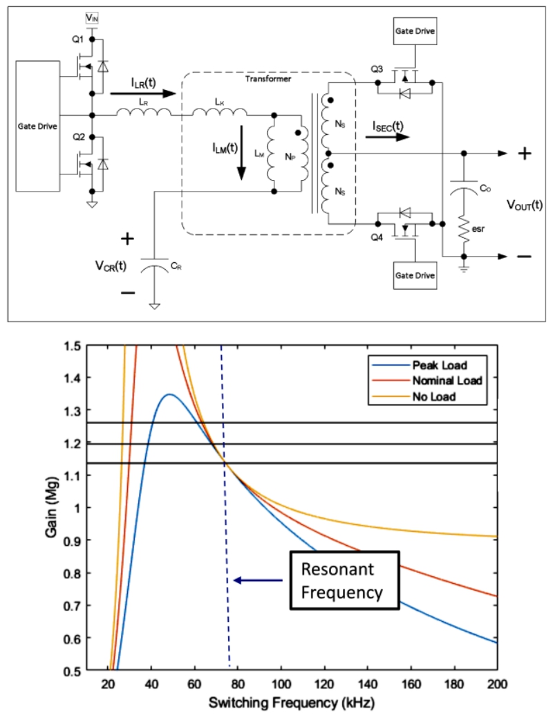 這種配置有幾個(gè)優(yōu)點(diǎn)。首先,它通過(guò)利用線(xiàn)圈和電容器之間的諧振來(lái)提供高效率,從而降低開(kāi)關(guān)損耗。此外,變壓器提供的電氣隔離允許轉換器的輸入和輸出分離,從而保護控制電路并允許調整變壓器變比。從增益響應曲線(xiàn)圖中可以看出,根據開(kāi)關(guān)頻率的不同,存在三種不同的情況。
