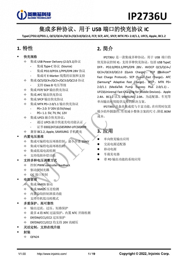 首先介紹的是IP2736,協(xié)議芯片在充電器中起到非常重要的作用,協(xié)議芯片一方面連接到充電器初級反饋或者次級降壓反饋,并通過(guò)連接的用電設備,調節充電器的輸出電壓為用電設備所需要的電壓,從而提供豐富的設備支持。