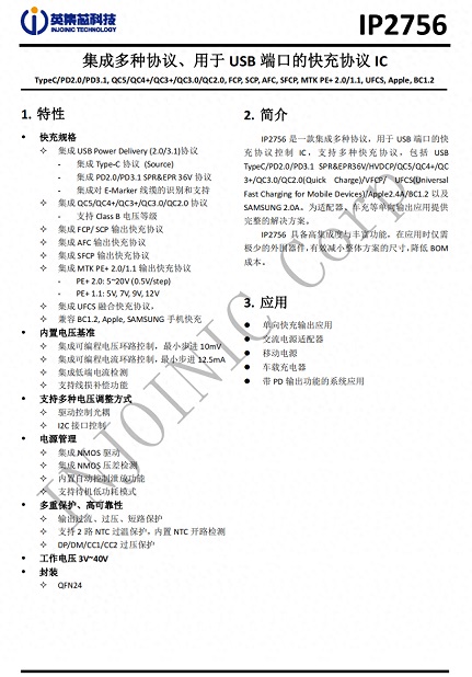 英集芯 IP2756 是一款集成多種協(xié)議,用于 USB 端口的快充協(xié)議控制 IC,支持多種快充協(xié)議,包括 PD2.0/PD3.1 SPR&EPR36V、HVDCP、QC5/4+/3+/3.0/2.0、VFCP、UFCS、Apple 2.4A、BC1.2 以及 SAMSUNG 2.0A。為適配器、車(chē)充等單向輸出應用提供完整的解決方案。