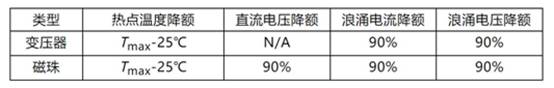 最后,磁珠選型時(shí)還需要注意降額使用。磁性器件的降額標準如表所示。