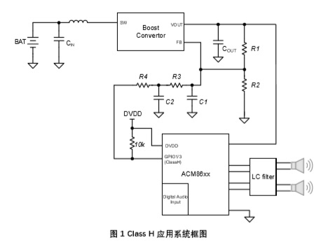 ACM86xx全系列數字輸入音頻功放均可支持Class H功能。ACM86xx以PWM 的形式給出的電壓調節信號,更低的占空比對應于更高的boost輸出電壓,反之亦然。此PWM信號, 經(jīng)過(guò)適當的RC低通濾波后,連接至boost的FB引腳,即可實(shí)現對于boost輸出電壓的動(dòng)態(tài)調節。只要boost具有足夠的功率輸出能力,ACM86xx的Class H功能可以與任何boost芯片配合。