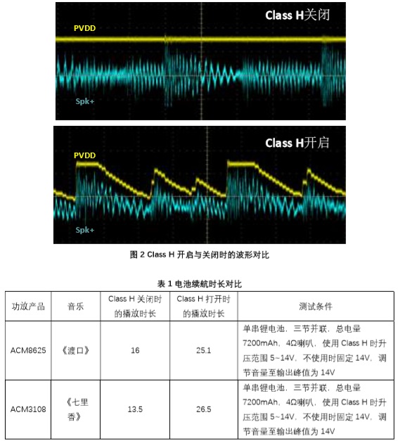 對于便攜式音頻系統,如便攜式藍牙音箱、拉桿音箱等,Class H技術(shù)可在相同的電池容量下,大幅提高續航時(shí)間,對于降低產(chǎn)品內部溫升亦有幫助。表1展示了同一套系統,在音樂(lè )、音量都相同的情況下,打開(kāi)或關(guān)閉Class H 功能的對比實(shí)測結果。當關(guān)閉Class H 功能時(shí),boost輸出電壓保持在最大音頻功率所對應的最高值。