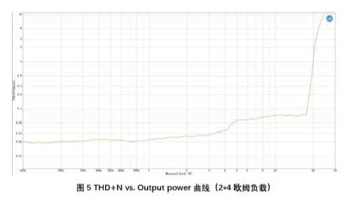 第二步,功放空載不接喇叭,輸入1kHz連續正弦波信號,掃描THD+N vs. Output Power曲線(xiàn)。在到達設計的最高輸出功率前,THD+N不應有明顯增加。