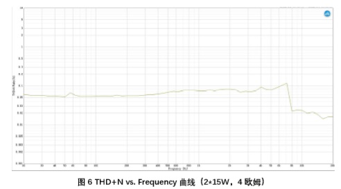 第四步,調整輸入幅值,使得輸出達到系統最大輸出功率,以正弦波作為輸入,掃描THD+N vs. Output Power曲線(xiàn)。在整個(gè)音頻帶內,THD+N不應超出系統要求的最大失真(通常為1%),如圖6所示。