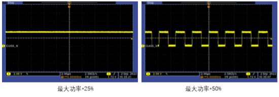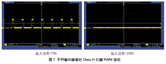 經(jīng)上述兩種方法判斷,如果故障仍然存在,則可以斷開(kāi)功放Class H引腳的所有連接(除了到 DVDD 上拉電阻應保留),給到功放不同幅值的輸入信號,用示波器觀(guān)察Class H引腳的PWM輸出波形。圖7為幾種不同輸入幅值時(shí),PWM的占空比變化情況。