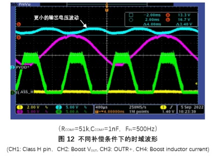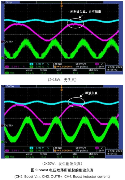 總之,當出現boost輸出電壓波動(dòng)過(guò)大導致削波失真時(shí),應首先考慮優(yōu)化boost環(huán)路參 數,改善其動(dòng)態(tài)負載性能。若仍然無(wú)法滿(mǎn)足要求,再考慮增大輸出電容,重新迭代環(huán)路優(yōu)化過(guò)程,直到削波失真程度降低到可以接受為止。