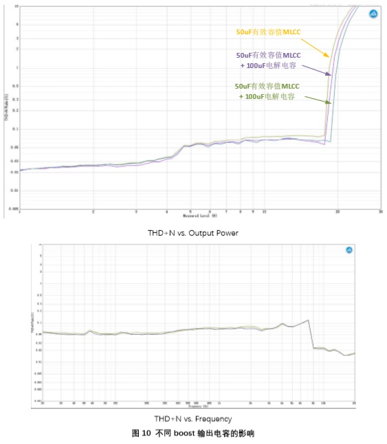 圖10是不同輸出電容組合,相同的環(huán)路補償參數下,以1kHz正弦波輸入掃描THD+N vs. Output Power 曲線(xiàn),再固定2*15W的輸出功率掃描THD+N vs. Frequency?梢(jiàn),對于目標最大音頻RMS功率 2*15W,僅使用50uF 陶瓷電容(考慮 DC bias 衰減后的有效容值), 已經(jīng)能夠滿(mǎn)足要求失真要求,而不必再另外增加boost輸出電容。