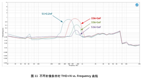考慮到 ESR 零點(diǎn)與負載主極點(diǎn)距離較遠,在保持環(huán)路穩定的前提下,補償零點(diǎn)越靠近負載 主極點(diǎn),則環(huán)路帶寬越高,動(dòng)態(tài)響應越好。這表現為重載條件到來(lái)時(shí)boost能夠快速響應,其輸出電壓不會(huì )跌落太大,發(fā)生削波失真。圖11為輸出功率為2*18W,其他測試條件相同,上述三組補償參數所對應的THD+N vs. Frequency掃描結果?梢(jiàn)經(jīng)過(guò)恰當補償的boost環(huán)路, 可以有效改善削波失真。