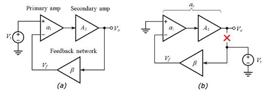 圖 1. (a) 復合電壓放大器的框圖。(b) 求出復合放大器的開(kāi)環(huán)增益 a c和噪聲增益 1/β 的電路。