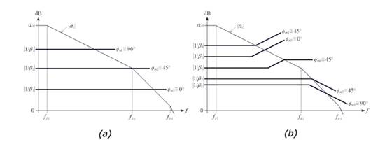 圖 2. (a) 經(jīng)常遇到的相位裕度情況,其中 (b) 與頻率無(wú)關(guān)的噪聲增益 1/β(jf) 和 (b) 與頻率相關(guān)的噪聲增益 1/β(jf)。