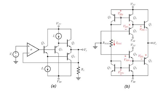 Q 1的功能是向負載 R L提供(或推送)電流,而 Q 2的功能是從 R L吸收(或拉出)電流;因此,Q 1 -Q 2對被稱(chēng)為形成推挽輸出級。晶體管 Q 3和 Q 4有雙重用途: