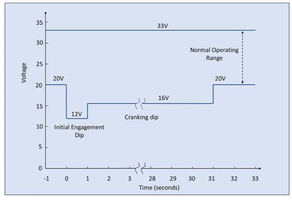 MIL-STD 1275/F 定義了 28VDC 電源的工作范圍,限制為 20V 和 33V,并且在初始“接合”電壓降至 12V 后啟動(dòng)電壓降至 16V。級別和時(shí)間顯示在圖1。