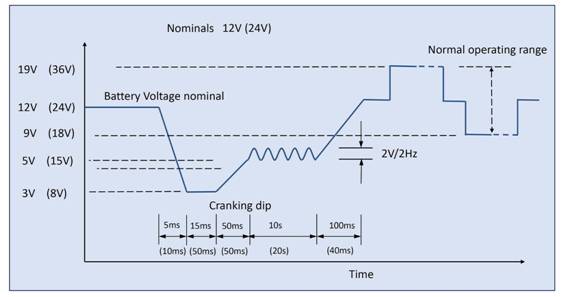 圖2: 軍用車(chē)輛直流電源范圍符合 DEF-STAN 61-5,適用于 12V 和(括號內)24V 系統