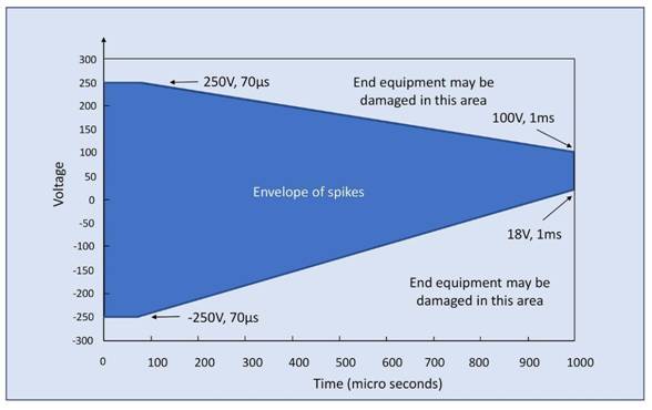 考慮到 MIL-STD 1275/F,要求設備能夠抵抗短尖峰,峰值高達 +/-250V,持續 70μs 最大值,在 1ms 內線(xiàn)性減小到 +100V 和 +18V 之間的值。任何單個(gè)尖峰的最大能量為 200mJ (圖3)。