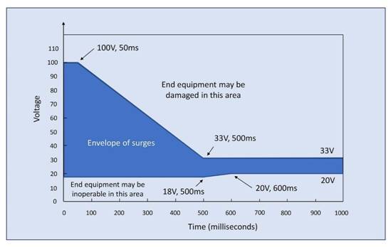 也可能存在高能量浪涌 降至 +100V 持續 50ms,線(xiàn)性降至 >33V 持續 500ms,而降至 18V 可持續 500ms,降至 <20V 持續 600ms(圖4)。