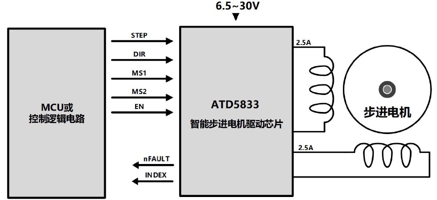 ATD5833是一款內置有譯碼器的智能步進(jìn)電機驅動(dòng)器。其輸出驅動(dòng)能力達到30V ±2.5A,最高支持16細分,同時(shí)可實(shí)現插補細分工作。 |